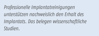Die Professionellen Implantatreinigungen in der Zahnarztpraxis und Ihre sorgfältige Mundhygiene erhalten Ihr Implantat und beugen bakteriellen Entzündungen vor. Da Professionelle Implantatreinigungen regelmäßig durchgeführt werden, leisten sie auch einen Beitrag zur Früherkennung: schon kleine Entzündungen oder Gewebeveränderungen in der Nähe Ihres Implantats können wir frühzeitig entdecken und die Heilung des betroffenen Bereichs einleiten.